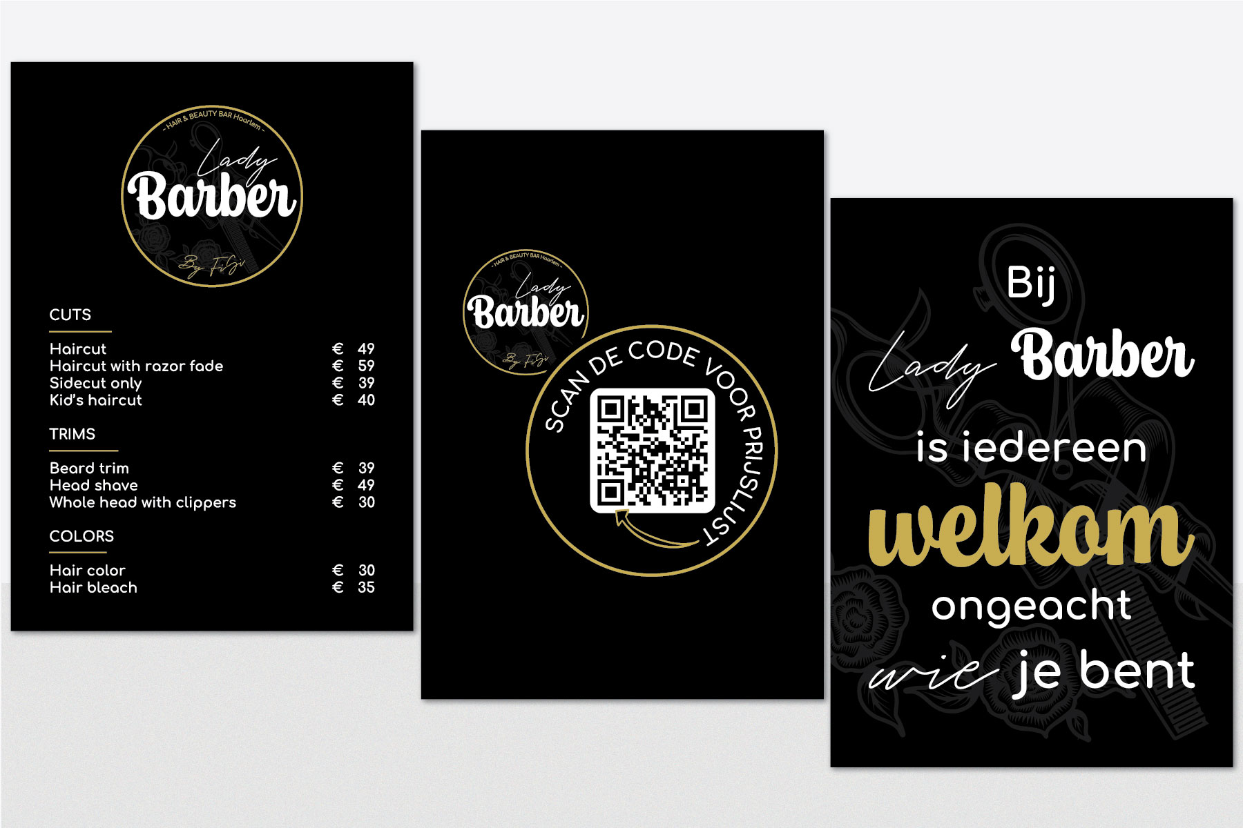 Voor Hair and Beauty Bar Haarlem heb ik de logo’s ontworpen voor de Lady Barber en voor Barber on Tour Jan Heideman. Ook de signing van de gevel heb ik ontworpen en posters.